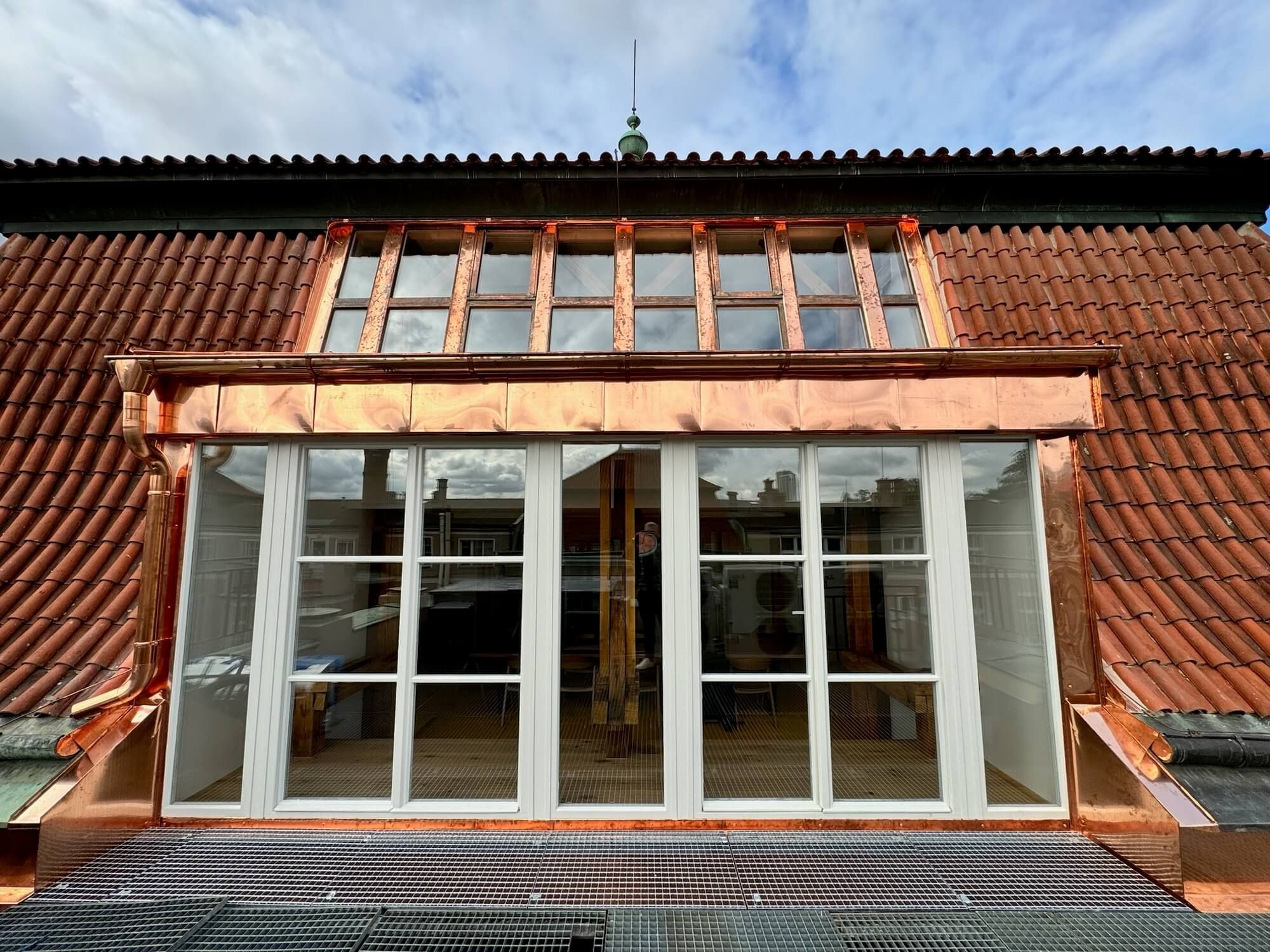 The project also included the installation of new skylights and roof window assemblies, which provide sufficient daylight and create a pleasant learning environment. In addition, a new roof terrace was built to provide a place for students and staff to relax and meet informally. The new glass entrance to these spaces not only enhances the aesthetic impression, but also improves access and orientation within the building.